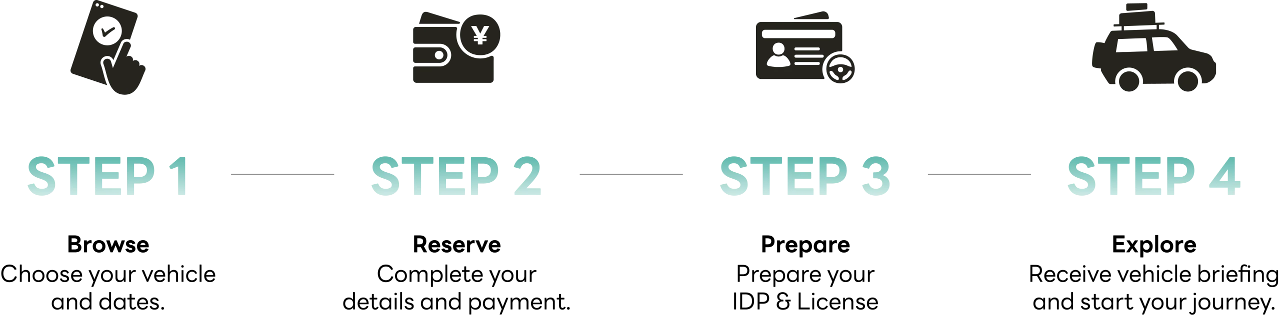 Choose your vehicle, travel dates, and any extras you need — all in just a few clicks.